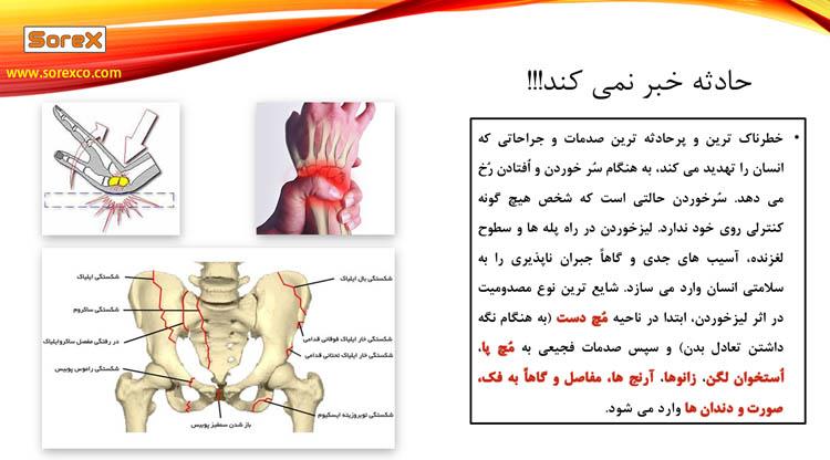 خطرناک ترین و پرحادثه ترین صدما و جراحاتی که انسان را تهدید می کند، به هنگام سُرخوردن و افتادن رخ می دهد. سُرخوردن حالتی است که شخص هیچ گونه کنترلی روی خود ندارد. لیز خوردن در راه پله ها و سطوح لغزنده، آسیب های جدی و گاها" جبران ناپذیری را به سلامتی انسان وارد می سازد. شایع ترین نوع مصدومیت در اثر لیز خوردن، ابتدا در ناحیه مچ دست (به هنگام نگه داشتن تعادل بدن) و سپس صدما فجیعی به مُچ پا، استخوان لگن، زانوها، آرنج ها، مفاصل و گاها" به فک، صورت و دندان ها وارد می شود.