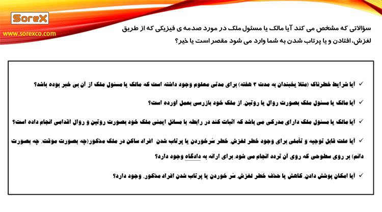 سوالاتی که مشخص می کند آیا مالک یا مسئول ملک در مورد صدمه ی فیزیکی که از طریق لغزش، افتادن و یا پرتاب شدن به شما وارد می شود مقصر است یا خیر؟